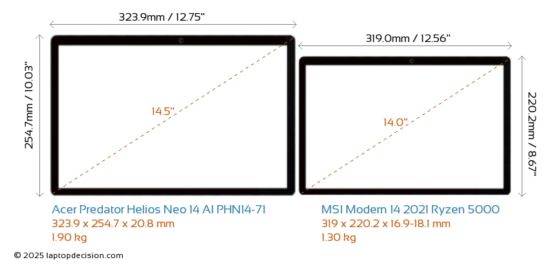 HDMIBoth Predator Helios Neo 14 AI PHN14-71 and Modern 14 2021 Ryzen 5000 feature an HDMI port. Predator Helios Neo 14 AI PHN14-71 offers 1x HDMI 2.1, while Modern 14 2021 Ryzen 5000 offers 1x HDMI 2.0.