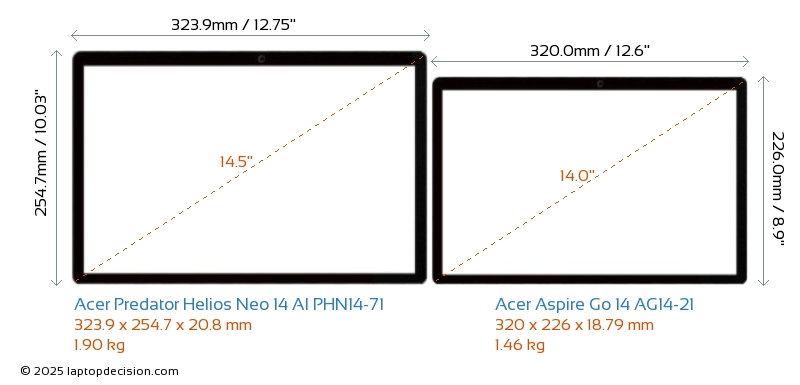 HDMIBoth Predator Helios Neo 14 AI PHN14-71 and Aspire Go 14 AG14-21 feature an HDMI port. Predator Helios Neo 14 AI PHN14-71 offers 1x HDMI 2.1, while Aspire Go 14 AG14-21 offers 1x HDMI 1.4.