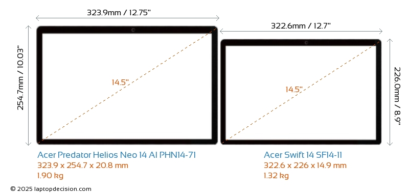 HDMI Predator Helios Neo 14 AI PHN14-71 features an HDMI port (1x HDMI 2.1) for connecting to external monitors. Swift 14 SF14-11 does not have an HDMI port.