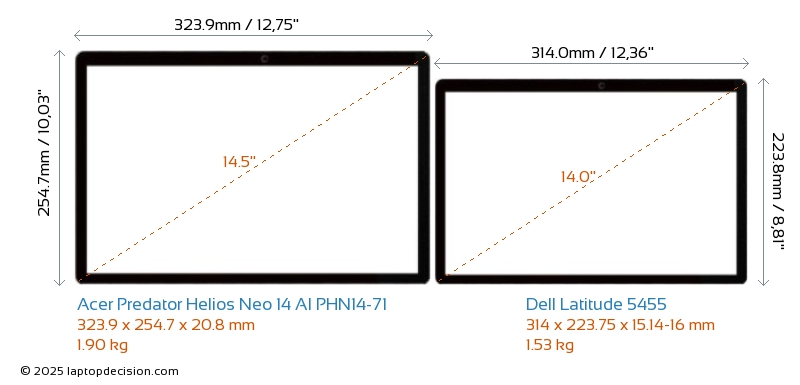 HDMIBoth Predator Helios Neo 14 AI PHN14-71 and Latitude 5455 feature an HDMI port (1x HDMI 2.1) for connecting to external monitors.