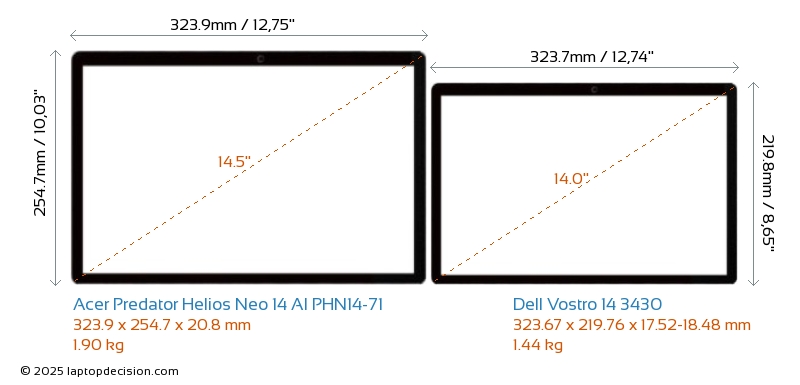 HDMIBoth Predator Helios Neo 14 AI PHN14-71 and Vostro 14 3430 feature an HDMI port. Predator Helios Neo 14 AI PHN14-71 offers 1x HDMI 2.1, while Vostro 14 3430 offers 1x HDMI 1.4.