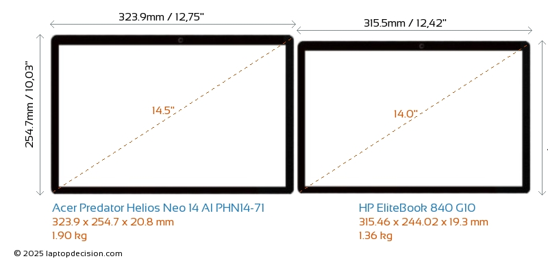 HDMIBoth Predator Helios Neo 14 AI PHN14-71 and EliteBook 840 G10 feature an HDMI port (1x HDMI 2.1) for connecting to external monitors.