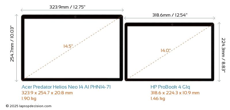 HDMIBoth Predator Helios Neo 14 AI PHN14-71 and ProBook 4 G1q feature an HDMI port (1x HDMI 2.1) for connecting to external monitors.