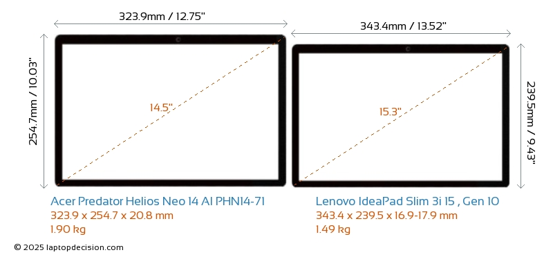 HDMIBoth Predator Helios Neo 14 AI PHN14-71 and IdeaPad Slim 3i 15 , Gen 10 feature an HDMI port. Predator Helios Neo 14 AI PHN14-71 offers 1x HDMI 2.1, while IdeaPad Slim 3i 15 , Gen 10 offers 1x HDMI 1.4.