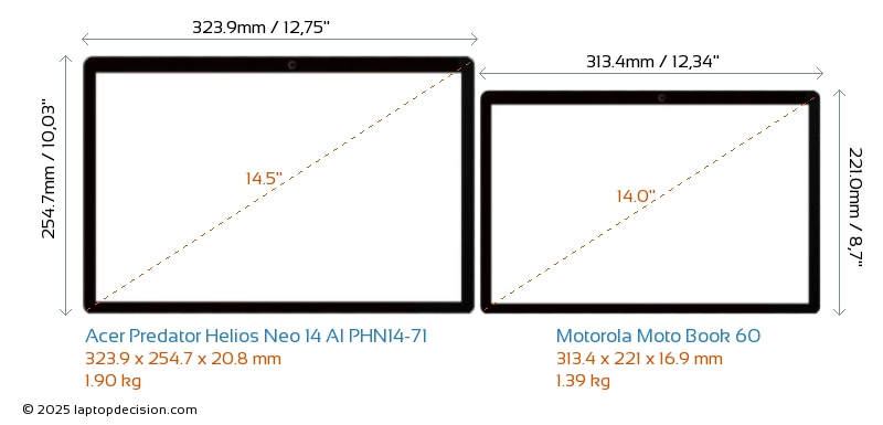 HDMIBoth Predator Helios Neo 14 AI PHN14-71 and Moto Book 60 feature an HDMI port. Predator Helios Neo 14 AI PHN14-71 offers 1x HDMI 2.1, while Moto Book 60 offers 1x HDMI 1.4.