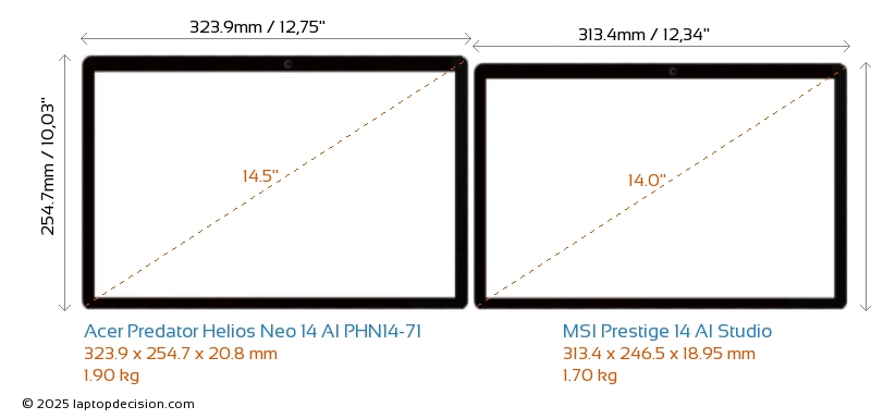HDMIBoth Predator Helios Neo 14 AI PHN14-71 and Prestige 14 AI Studio feature an HDMI port (1x HDMI 2.1) for connecting to external monitors.
