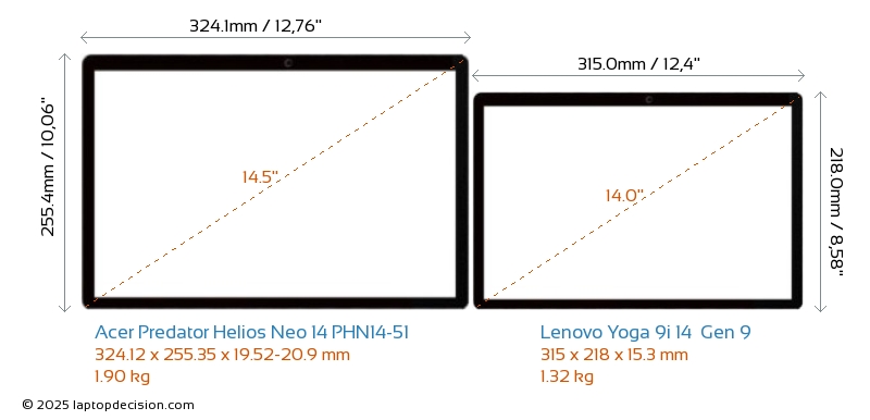 HDMI Predator Helios Neo 14 PHN14-51 features an HDMI port (1x HDMI 2.1) for connecting to external monitors. Yoga 9i 14 Gen 9 does not have an HDMI port.