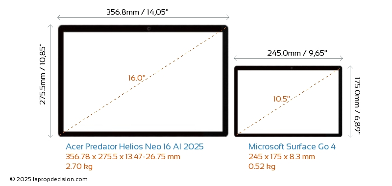 HDMI Predator Helios Neo 16 AI 2025 features an HDMI port (1x HDMI 2.1) for connecting to external monitors. Surface Go 4 does not have an HDMI port.