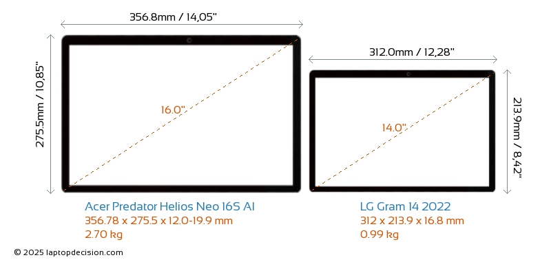 HDMIBoth Predator Helios Neo 16S AI and Gram 14 2022 feature an HDMI port. Predator Helios Neo 16S AI offers 1x HDMI 2.1, while Gram 14 2022 offers 1x HDMI 2.0.