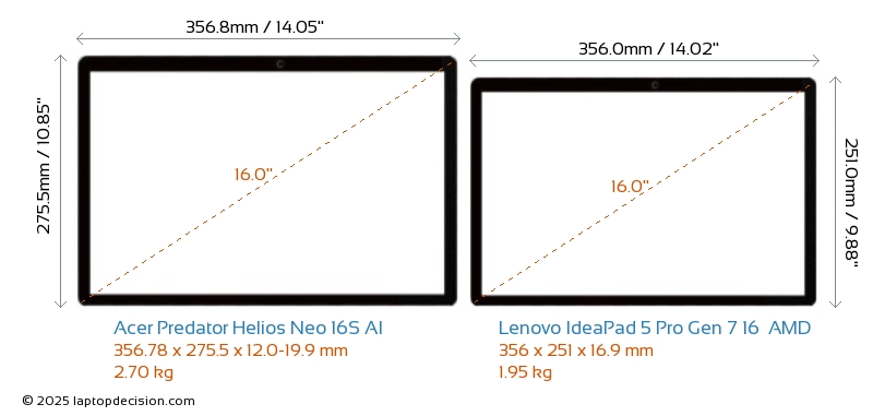 HDMIBoth Predator Helios Neo 16S AI and IdeaPad 5 Pro Gen 7 16 AMD feature an HDMI port. Predator Helios Neo 16S AI offers 1x HDMI 2.1, while IdeaPad 5 Pro Gen 7 16 AMD offers 1x HDMI 2.0.