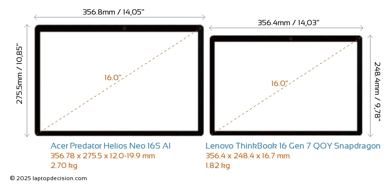 HDMIBoth Predator Helios Neo 16S AI and ThinkBook 16 Gen 7 QOY Snapdragon feature an HDMI port (1x HDMI 2.1) for connecting to external monitors.