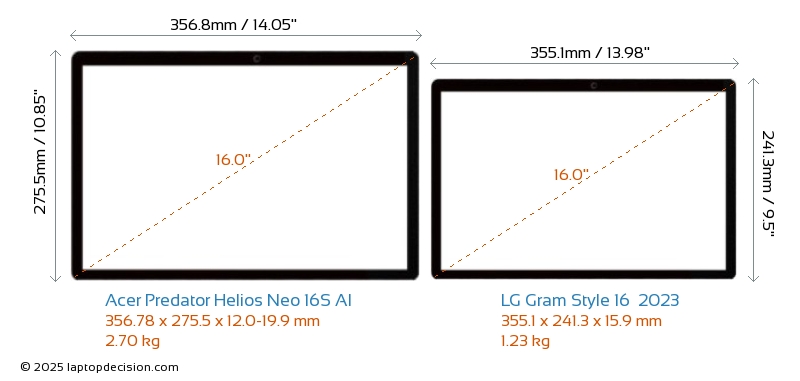 HDMI Predator Helios Neo 16S AI features an HDMI port (1x HDMI 2.1) for connecting to external monitors. Gram Style 16 2023 does not have an HDMI port.