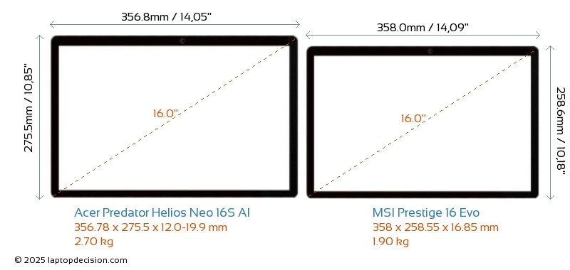 HDMIBoth Predator Helios Neo 16S AI and Prestige 16 Evo feature an HDMI port. Predator Helios Neo 16S AI offers 1x HDMI 2.1, while Prestige 16 Evo offers 1x HDMI 2.0.