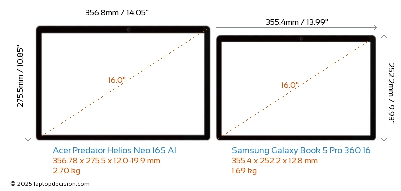 HDMIBoth Predator Helios Neo 16S AI and Galaxy Book 5 Pro 360 16 feature an HDMI port (1x HDMI 2.1) for connecting to external monitors.