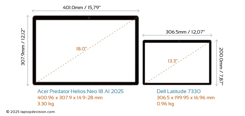 USBBoth Predator Helios Neo 18 AI 2025 and Latitude 7330 have USB-A ports. Predator Helios Neo 18 AI 2025 has 4x USB 3.2 USB-A ports, while Latitude 7330 has 1x USB 3.2 USB-A ports.Both Predator Helios Neo 18 AI 2025 and Latitude 7330 have USB Type-C ports. Predator Helios Neo 18 AI 2025 has 2x USB 4.0 USB Type-C ports, while Latitude 7330 has 2x USB 3.2 USB Type-C ports.