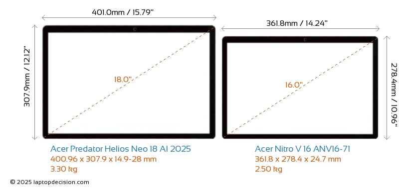 HDMIBoth Predator Helios Neo 18 AI 2025 and Nitro V 16 ANV16-71 feature an HDMI port (1x HDMI 2.1) for connecting to external monitors.