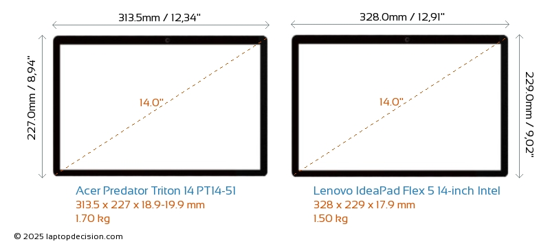 HDMIBoth Predator Triton 14 PT14-51 and IdeaPad Flex 5 14-inch Intel feature an HDMI port. Predator Triton 14 PT14-51 offers 1x HDMI 2.1, while IdeaPad Flex 5 14-inch Intel offers 1x HDMI 1.4.