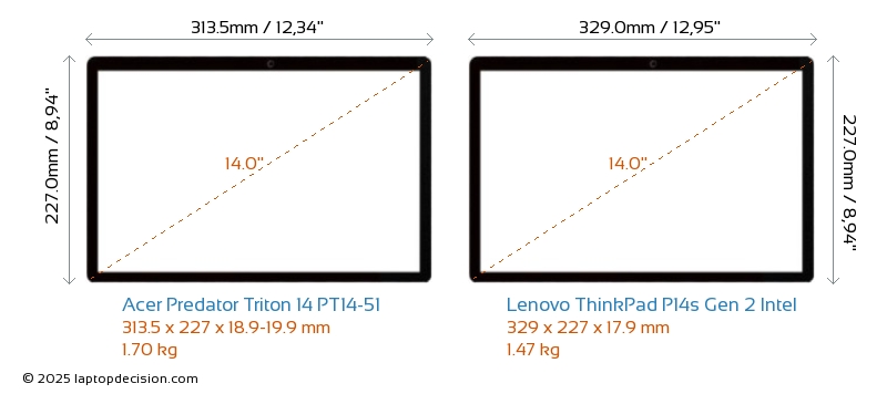 HDMIBoth Predator Triton 14 PT14-51 and ThinkPad P14s Gen 2 Intel feature an HDMI port. Predator Triton 14 PT14-51 offers 1x HDMI 2.1, while ThinkPad P14s Gen 2 Intel offers 1x HDMI 2.0.