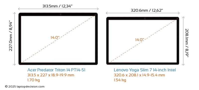 HDMIBoth Predator Triton 14 PT14-51 and Yoga Slim 7 14-inch Intel feature an HDMI port. Predator Triton 14 PT14-51 offers 1x HDMI 2.1, while Yoga Slim 7 14-inch Intel offers 1x HDMI 2.0.