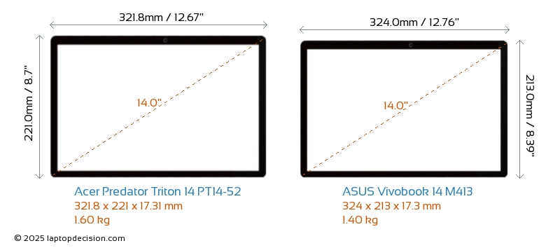 HDMIBoth Predator Triton 14 PT14-52 and Vivobook 14 M413 feature an HDMI port. Predator Triton 14 PT14-52 offers 1x HDMI 2.1, while Vivobook 14 M413 offers 1x HDMI 1.4.