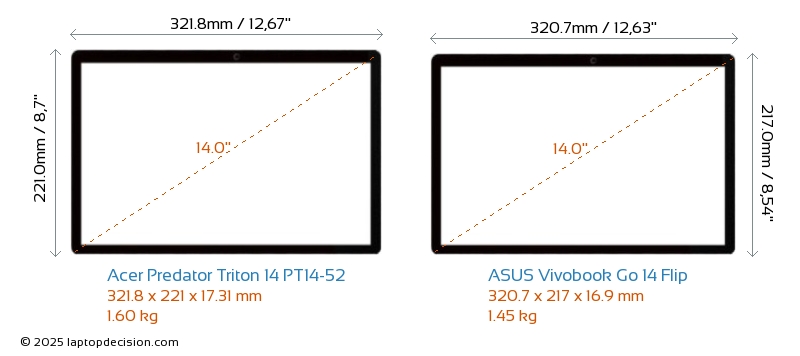 HDMIBoth Predator Triton 14 PT14-52 and Vivobook Go 14 Flip feature an HDMI port. Predator Triton 14 PT14-52 offers 1x HDMI 2.1, while Vivobook Go 14 Flip offers 1x HDMI 1.4.
