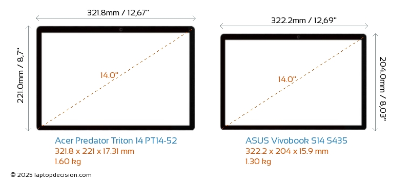 USBBoth Predator Triton 14 PT14-52 and Vivobook S14 S435 feature 2x USB 3.2 USB-A ports.Both Predator Triton 14 PT14-52 and Vivobook S14 S435 feature 2x USB 3.2 USB Type-C ports.