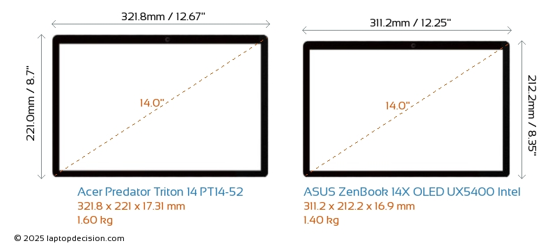 HDMIBoth Predator Triton 14 PT14-52 and ZenBook 14X OLED UX5400 Intel feature an HDMI port. Predator Triton 14 PT14-52 offers 1x HDMI 2.1, while ZenBook 14X OLED UX5400 Intel offers 1x HDMI 2.0.