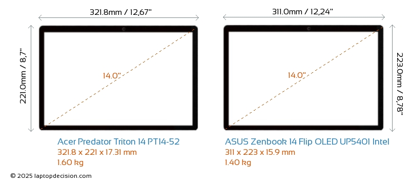 ThunderboltBoth Predator Triton 14 PT14-52 and Zenbook 14 Flip OLED UP5401 Intel feature Thunderbolt ports. Predator Triton 14 PT14-52 has Thunderbolt 4, while Zenbook 14 Flip OLED UP5401 Intel has Thunderbolt 3.2.