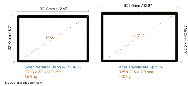 USBBoth Predator Triton 14 PT14-52 and TravelMate Spin P4 feature 2x USB 3.2 USB-A ports.Both Predator Triton 14 PT14-52 and TravelMate Spin P4 have USB Type-C ports. Predator Triton 14 PT14-52 has 2x USB 3.2 USB Type-C ports, while TravelMate Spin P4 has 1x USB 3.2 USB Type-C ports.