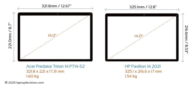 HDMIBoth Predator Triton 14 PT14-52 and Pavilion 14 2021 feature an HDMI port. Predator Triton 14 PT14-52 offers 1x HDMI 2.1, while Pavilion 14 2021 offers 1x HDMI 2.0.