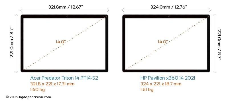 HDMIBoth Predator Triton 14 PT14-52 and Pavilion x360 14 2021 feature an HDMI port. Predator Triton 14 PT14-52 offers 1x HDMI 2.1, while Pavilion x360 14 2021 offers 1x HDMI 2.0.