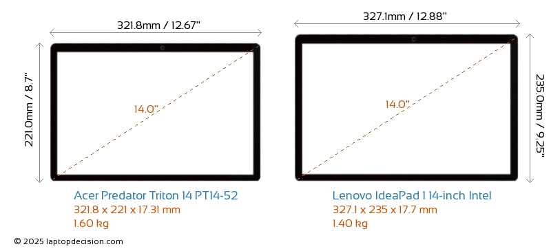 HDMIBoth Predator Triton 14 PT14-52 and IdeaPad 1 14-inch Intel feature an HDMI port. Predator Triton 14 PT14-52 offers 1x HDMI 2.1, while IdeaPad 1 14-inch Intel offers 1x HDMI 1.4.
