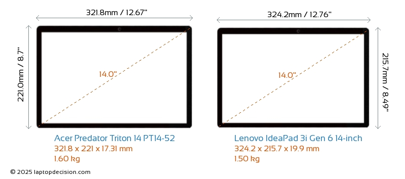 HDMIBoth Predator Triton 14 PT14-52 and IdeaPad 3i Gen 6 14-inch feature an HDMI port. Predator Triton 14 PT14-52 offers 1x HDMI 2.1, while IdeaPad 3i Gen 6 14-inch offers 1x HDMI 1.4.