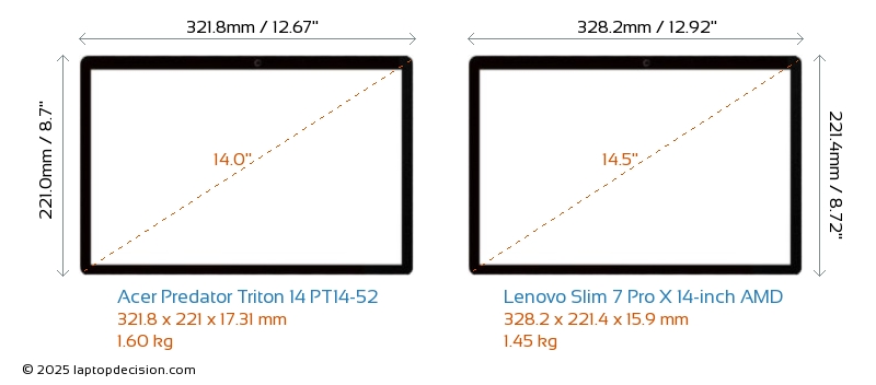 HDMI Predator Triton 14 PT14-52 features an HDMI port (1x HDMI 2.1) for connecting to external monitors. Slim 7 Pro X 14-inch AMD does not have an HDMI port.