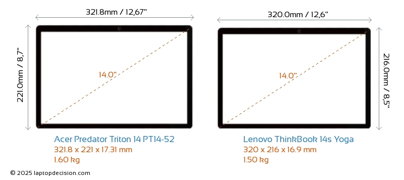 USBBoth Predator Triton 14 PT14-52 and ThinkBook 14s Yoga feature 2x USB 3.2 USB-A ports.Both Predator Triton 14 PT14-52 and ThinkBook 14s Yoga have USB Type-C ports. Predator Triton 14 PT14-52 has 2x USB 3.2 USB Type-C ports, while ThinkBook 14s Yoga has 2x USB 4.0 USB Type-C ports.