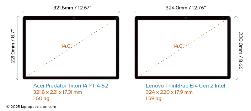 HDMIBoth Predator Triton 14 PT14-52 and ThinkPad E14 Gen 2 Intel feature an HDMI port. Predator Triton 14 PT14-52 offers 1x HDMI 2.1, while ThinkPad E14 Gen 2 Intel offers 1x HDMI 1.4.