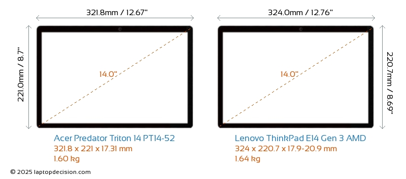 HDMIBoth Predator Triton 14 PT14-52 and ThinkPad E14 Gen 3 AMD feature an HDMI port. Predator Triton 14 PT14-52 offers 1x HDMI 2.1, while ThinkPad E14 Gen 3 AMD offers 1x HDMI 1.4.