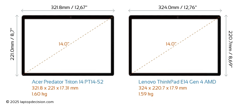 HDMIBoth Predator Triton 14 PT14-52 and ThinkPad E14 Gen 4 AMD feature an HDMI port. Predator Triton 14 PT14-52 offers 1x HDMI 2.1, while ThinkPad E14 Gen 4 AMD offers 1x HDMI 1.4.