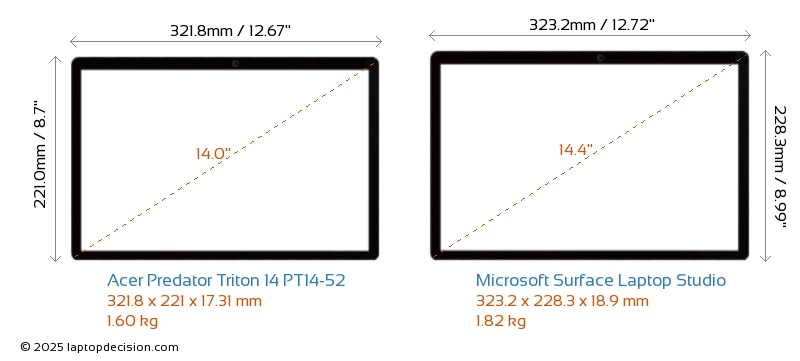 HDMI Predator Triton 14 PT14-52 features an HDMI port (1x HDMI 2.1) for connecting to external monitors. Surface Laptop Studio does not have an HDMI port.