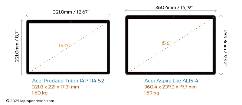 HDMIBoth Predator Triton 14 PT14-52 and Aspire Lite AL15-41 feature an HDMI port. Predator Triton 14 PT14-52 offers 1x HDMI 2.1, while Aspire Lite AL15-41 offers 1x HDMI 1.4.