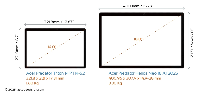 USBBoth Predator Triton 14 PT14-52 and Predator Helios Neo 18 AI 2025 have USB-A ports. Predator Triton 14 PT14-52 has 2x USB 3.2 USB-A ports, while Predator Helios Neo 18 AI 2025 has 4x USB 3.2 USB-A ports.Both Predator Triton 14 PT14-52 and Predator Helios Neo 18 AI 2025 have USB Type-C ports. Predator Triton 14 PT14-52 has 2x USB 3.2 USB Type-C ports, while Predator Helios Neo 18 AI 2025 has 2x USB 4.0 USB Type-C ports.