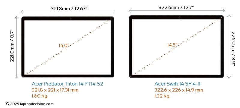 HDMI Predator Triton 14 PT14-52 features an HDMI port (1x HDMI 2.1) for connecting to external monitors. Swift 14 SF14-11 does not have an HDMI port.