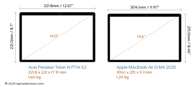 HDMI Predator Triton 14 PT14-52 features an HDMI port (1x HDMI 2.1) for connecting to external monitors. MacBook Air 13 M4 2025 does not have an HDMI port.