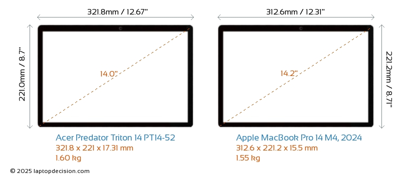 HDMIBoth Predator Triton 14 PT14-52 and MacBook Pro 14 M4, 2024 feature an HDMI port (1x HDMI 2.1) for connecting to external monitors.