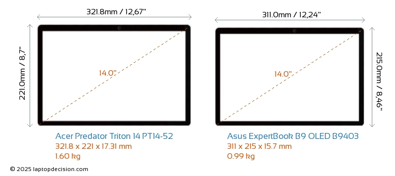 USBBoth Predator Triton 14 PT14-52 and ExpertBook B9 OLED B9403 have USB-A ports. Predator Triton 14 PT14-52 has 2x USB 3.2 USB-A ports, while ExpertBook B9 OLED B9403 has 1x USB 3.2 USB-A ports.Both Predator Triton 14 PT14-52 and ExpertBook B9 OLED B9403 have USB Type-C ports. Predator Triton 14 PT14-52 has 2x USB 3.2 USB Type-C ports, while ExpertBook B9 OLED B9403 has 2x USB 4.0 USB Type-C ports.
