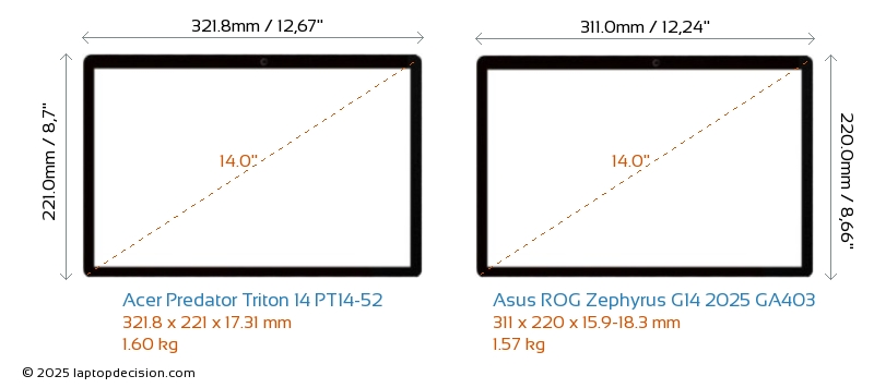 Thunderbolt Predator Triton 14 PT14-52 is equipped with Thunderbolt 4 port. ROG Zephyrus G14 2025 GA403 does not have Thunderbolt port.