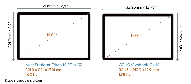 HDMIBoth Predator Triton 14 PT14-52 and Vivobook Go 14 feature an HDMI port. Predator Triton 14 PT14-52 offers 1x HDMI 2.1, while Vivobook Go 14 offers 1x HDMI 1.4.
