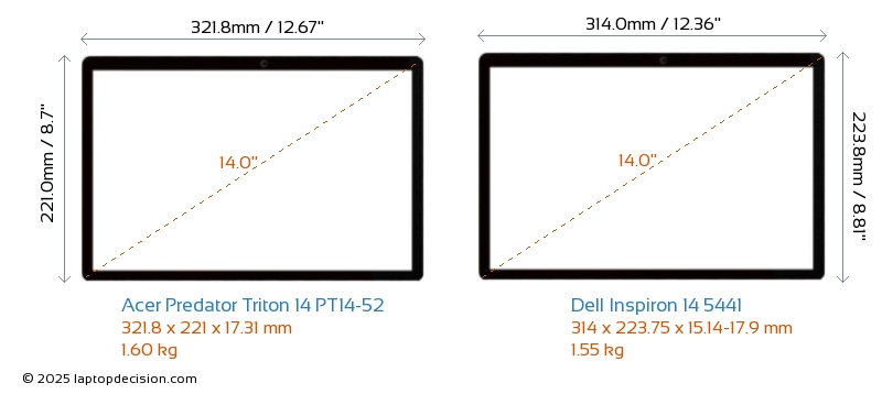 HDMI Predator Triton 14 PT14-52 features an HDMI port (1x HDMI 2.1) for connecting to external monitors. Inspiron 14 5441 does not have an HDMI port.