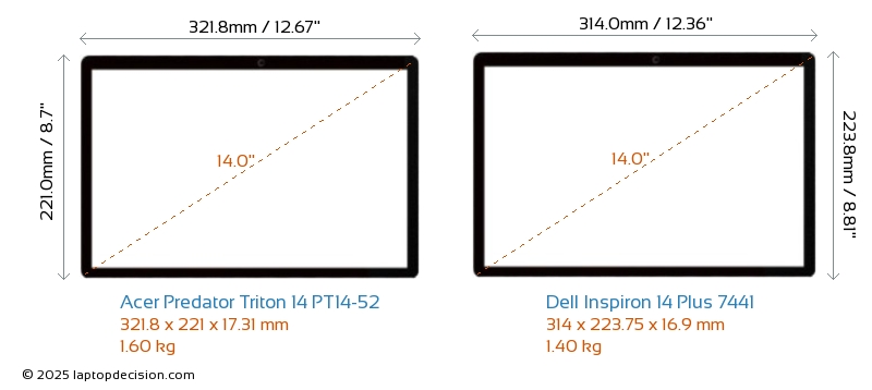 USBBoth Predator Triton 14 PT14-52 and Inspiron 14 Plus 7441 have USB-A ports. Predator Triton 14 PT14-52 has 2x USB 3.2 USB-A ports, while Inspiron 14 Plus 7441 has 1x USB 3.2 USB-A ports.Both Predator Triton 14 PT14-52 and Inspiron 14 Plus 7441 have USB Type-C ports. Predator Triton 14 PT14-52 has 2x USB 3.2 USB Type-C ports, while Inspiron 14 Plus 7441 has 2x USB 4.0 USB Type-C ports.
