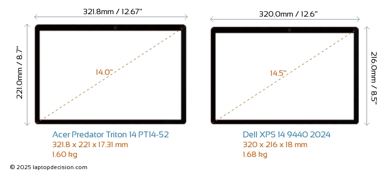 HDMI Predator Triton 14 PT14-52 features an HDMI port (1x HDMI 2.1) for connecting to external monitors. XPS 14 9440 2024 does not have an HDMI port.